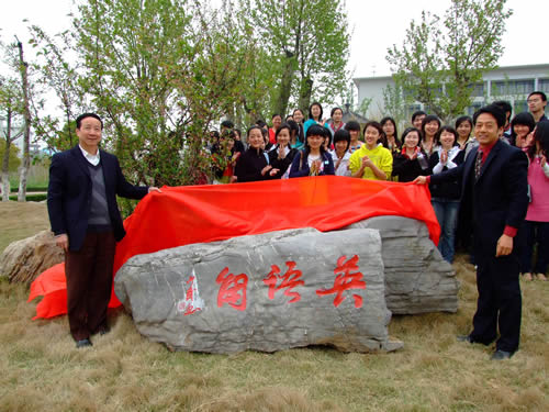 为了满足我校学生外语学习的需求,活跃外语的学习氛围,提高学生的文化素养, 经外语系申请,校党政联席会议决定,在蹊园十二生肖园辟建英语活动角并立牌。我们特邀请了传媒技术学院党总支书记、南京邮电大学金川书画社社长、江苏省花鸟画研究会副秘书长张少武题写了“英语角”三个大字, 刻勒于岩石之上。仪式上,朱纪伟书记和张少武书记分别发表了热情洋溢的讲话,对“英语角”活动永久选址的落成表示热烈祝贺,希望“英语角”活动能够成为同学们相互沟通、相互交流、相互学习英语口语的一个很好的平台。随后在同学们热烈的掌声中,朱纪伟书记和张少武书记为“英语角”石碑揭幕。