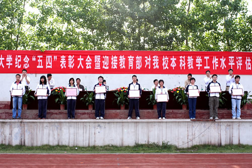校党委副书记、副校长唐金土老师在表彰大会上作了重要讲话。唐书记对首先对被表彰的集体和个人表示祝贺,同时向全体学生线老师和全体同学提出了三点希望:一、希望全体同学进一步领会“五四”精神,把“五四”精神落实到我们具体的迎评工作中来。二、希望全校同学进一步高度重视,认清形势,以强烈的责任感和主人翁精神投入到迎评工作中。三、希望全体党员、干部发挥先锋模范作用,以实际行动带领全校学生积极投入到迎评创优工作中。