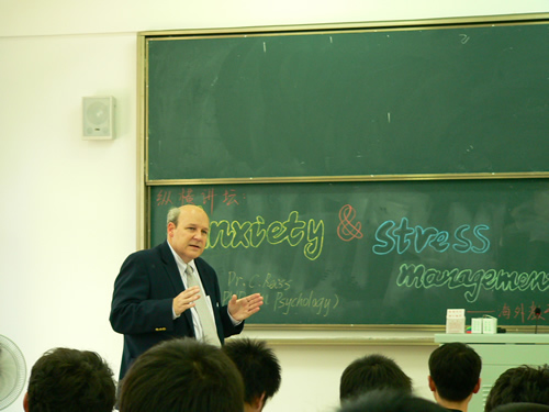 2008年5月12日15:00,海外教育学院“纵横讲坛”邀请了美国弗罗里达理工学院心理学博士、美国纽约理工学院教授Dr.Christopher·Reiss做了一场题为《Anxiety and Stress Management》的讲座,向同学们介绍如何在学习中减缓压力,进行自我调节。