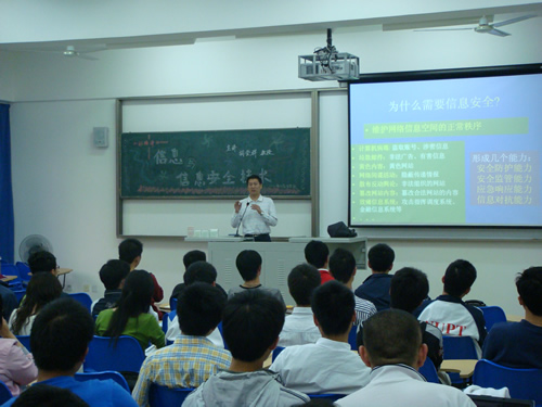 胡教授针对现代信息社会为什么需要信息安全,需要怎样的信息安全,如何在病毒、窃听、黑客等危害公共信息安全因素层出不穷的情况下,有效地保障公众的信息安全等问题进行了深入浅出的讲述,并列举了大量生动的例子介绍量子技术、生物计算技术等信息安全领域的一些最新研究成果。讲座引起了同学们的极大兴趣,启发了大家的思路。同学们踊跃提问,向教授请教信息安全发展的新技术,攻与防的相互博弈等问题。讲座取得了很好的效果。