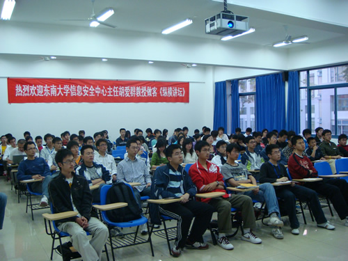 2008年5月13日晚,东南大学信息安全中心主任胡爱群教授为我院师生带来一场题为“信息与信息安全技术”的精彩讲座。海外教育学院院长吴蒙教授、分团委副书记赵伟老师出席了讲座,吴蒙院长介绍了胡教授的学术经历。