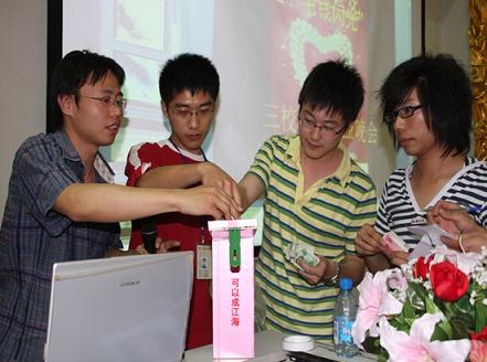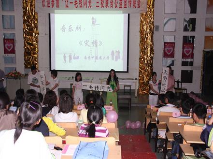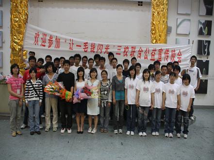 继5月12日的三校联合启动仪式以及13、14日的广场宣传之后,数理学院于5月15日18:30在仙林特大教室成功举办了“让一毛钱闪光” 三校联合赈灾义卖公益晚会,进一步将此项活动推向高潮。校团委副书记何海洋、数理学院党委副书记高志华、光电工程学院分团委副书记王志峰、数理学院分团委副书记李伯虎、辅导员邵斌、校学生会主席凌海峰、南京中医药大学信息技术学院学生会副主席周昙、南京工业职业技术学院学生会副主席仝鑫以及全校兄弟院系学生会主席作为嘉宾莅临现场。