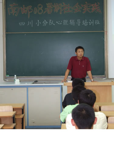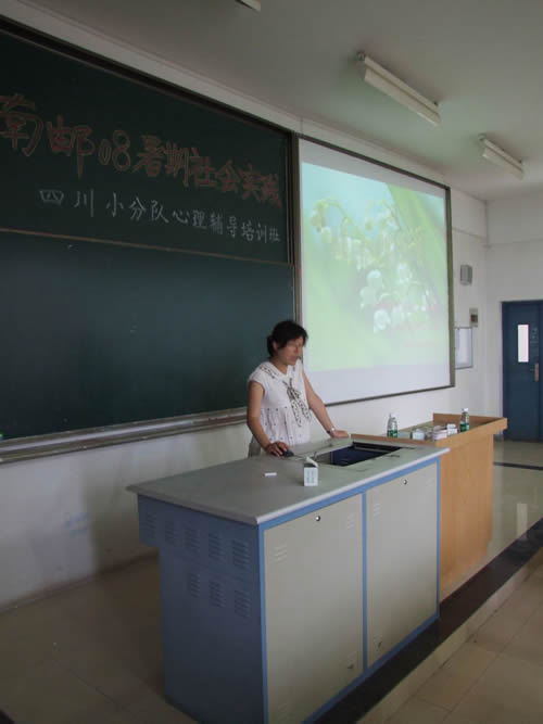 面对特殊的培训对象,心理咨询中心的陆晓花老师带领大家认识、分析了灾难后人们的一些正常的情绪反应。陆老师还通过生动的例子与有趣的游戏,传授给大家常用的心理辅导方法和简单的情感引导技巧。同时她提醒大家回到灾区参与重建工作时,要充分了解当地的特殊情况,正确面对要处理的问题。
