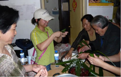 随后,同学们和老人们一起包粽子。同学们都没有包粽子的经验,老人们就手把手地指导,包得可谓花样百出,妙趣横生。与此同时,同学们还为老人们献上了丰富多彩的文艺节目。笛子独奏《城里的月光》、独舞《风随竹》等节目博得了老人们的鼓掌喝彩。