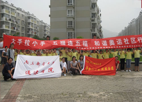 2008年7月16日,在我校通达学院党委副书记王立辉和分团委书记尹志丽等老师的带领下,通达学院暑期社会实践服务团走进栖霞区五福家园经济适用房社区,开展主题为“大手拉小手 五福连五福 和谐奥运社区行”暑期社会实践活动。实践队伍包括通达学院5大社团主要骨干和部分志愿者同学。活动内容旨在宣传奥运文化、普及环保知识、丰富经济适用房社区居民文化生活、拓宽小学生的暑期科技文化知识。