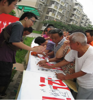 图二:现场发放环保袋和签名活动