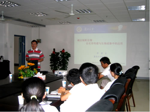 李富友教授年仅35岁,是复旦大学最年轻的博士生导师之一,曾先后获得2003年中国化学会“青年化学奖”、入选2006年教育部“新世纪优秀人才支持计划”,并于日前获得国家自然科学基金委员会杰出青年基金资助。李富友教授为大家作了题为“磷光铱配合物在化学传感与生物成像中的应用”的报告,深入浅出地讲授了一系列新型磷光铱配合物设计、制备和生物检测应用,概念新颖,思路敏锐,在座师生都受益匪浅。