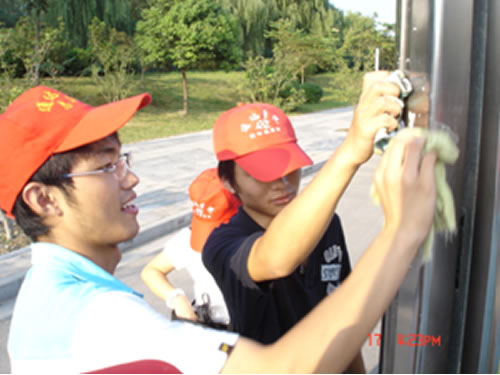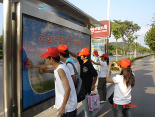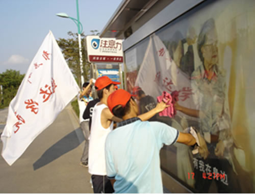 初秋的阳光虽然还是那么炎热,但丝毫没有阻挡志愿者们的热情,他们用自带的清洁工具,仔细的擦洗着公交站台的角角落落,很快在大家的齐心协力下,布满“牛皮癣”和灰尘的公交站台很快焕然一新,当等车的乘客用赞许的目光看着我们志愿者的时候,志愿者感到非常开心,他们为能在南京创建文明城市中付出自己的努力而感到自豪。