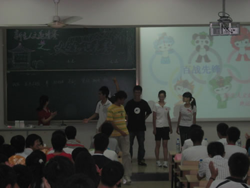 08级新生参与热情高涨,共有10个新生班级参加了比赛,每个班均派出一个四人组成的答题队伍,起了诸如“pig run”“挑战者”、“界”、“东方不败”等有趣的队名为自己鼓舞士气。不仅答题的同学激情澎湃,强大的后援团也不甘示弱,大声喊出本班的夺冠宣言,气氛非常热烈。