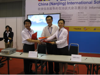在欧美信息服务外包专场会上,南京市鼓楼区政府、南京邮电大学和北京信必优教育科技服务有限公司联合签署了《共建南京软件及服务外包人才培养基地协议》。南京市鼓楼区区委常委、常委副区长朱志宏、南京邮电大学副校长黄维、北京信必优教育科技服务有限公司总裁Julia Yang代表三方在协议上签字。鼓楼区、南京邮电大学和北京信必优教育科技服务有限公司的代表分别作了发言。
