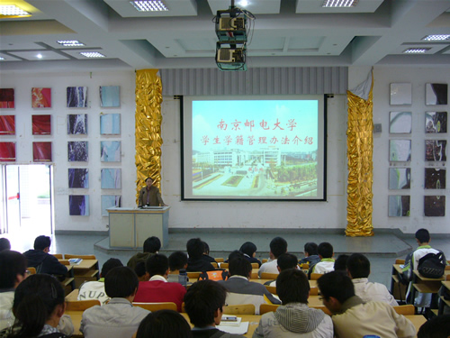 11月3日下午,仙林校区特大教室几乎坐满了2008级部分专业的新生,教务处处长陈鹤鸣教授做了“南京邮电大学学生学籍管理办法介绍”的专题报告,拉开了教务处在2008级新生中开展学籍宣讲工作的序幕。陈处长从学籍管理的概念、制订学籍管理办法的依据、学籍管理办法的演变介绍了学籍管理的概况,从弹性学制、考核与成绩记载、重修补考制度、编级、转专业、毕业、退学、学籍学历电子注册等8个方面重点强调了我校基于学分制的学籍管理办法的核心内容,介绍了学士学位授予办法和学分制收费管理办法,并提醒学生要充分利用学籍管理办法中的有利方面、经常关注教务教学信息公告、熟练使用教务管理信息系统、熟悉本专业培养计划、积极参与网上教师测评工作等五个方面的注意事项。