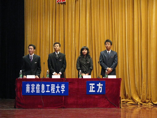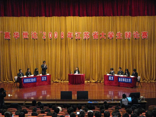 2008年11月7日晚19点,“嘉华世达”2008年江苏省大学生辩论赛最后一场初赛在南京邮电大学仙林校区大学生活动中心举行。本场比赛的评委是南京邮电大学校办副主任徐雷,南京邮电大学理学院党委副书记高志华,南京邮电大学人文与社会科学学院党委副书记李承晟。南京邮电大学学生会副主席石磊同学担任辩论赛的主席。