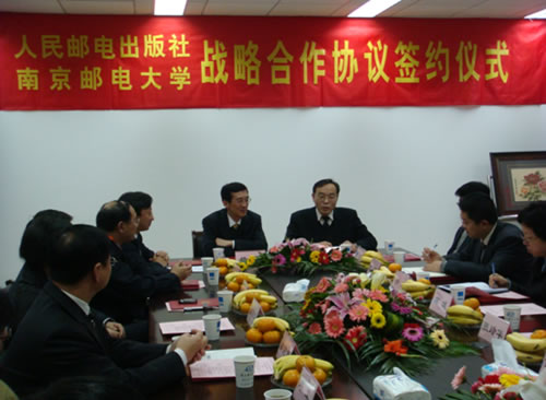 人民邮电出版社季仲华社长和杨震校长正式签署了《战略合作协议》。基于战略合作协议,成立了“人民邮电出版社南京邮电大学教材出版分部”,组建了“人民邮电出版社南京邮电大学教材编委会”。季社长和杨校长共同为“人民邮电出版社南京邮电大学教材出版分部”铜牌揭幕,并分别向出版分部的主任和副主任、教材编委会主任、副主任及编委等人员颁发了聘书。