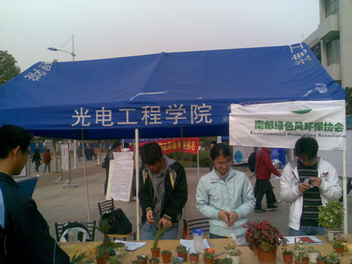 为了能够让绿色植物走进寝室,倡导绿色的生活环境,引领大学生们追求一种绿色健康的生活方式,光电工程学院“绿色风”环保协会于11月24—26日在南二广场开展了"绿色进寝室"公益活动。