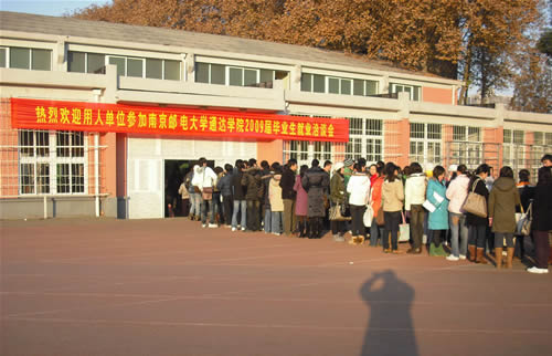 2008年12月6日,我院在三牌楼校区体育馆举办了“南京邮电大学通达学院2009届毕业生就业洽谈会”,联创科技有限公司、上海方捷信息技术有限公司、南京华苏科技有公司、深圳金伦科技有限公司等17家企事业单位共40多位招聘工作人员到会,近千名09届通达毕业生与用人单位进行了洽谈。