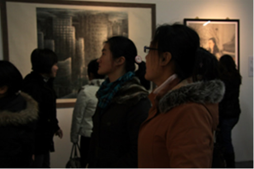 开幕式后,同学们进行了参观。展览包括中国画、油画、版画、雕塑、水彩、水粉画及书法作品。参展作品之多、水平之高、影响之大,令人叹服。写实的绘画作品栩栩如生、惟妙惟肖;抽象派艺术作品发人深思、耐人寻味;从不同字体、不同内容的书法作品中可见中华文化的博大精深。在参观展览的过程中,同学们都抱着认真学习的态度观摩作品,揣摩艺术家们艺术创作的视角和手法,时不时地按动照相机的快门。透过一件件作品,我们也看到了改革开放以来,中国的快速发展和崛起,体会到了改革开放跨时代的意义,民族自豪感和爱国精神得到了升华,更加坚定了共产主义信念。