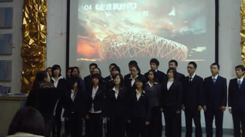 全院共有十二支代表队参加了比赛。《感恩的心》、《爱因为在心中》、《明天会更好》、《走进新时代》,一首首赞颂改革开放、反映三十年巨变的歌曲深情地表达了同学们对祖国改革开放三十周年的感叹和祝福,赢得了一次又一次的热烈掌声。伴随着祖国三十年风风雨雨的Flash播放,《保卫黄河》唱响,全体同学起立跟着激昂的音乐一起大合唱,以表达对美好祖国的礼赞。