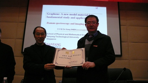 受聘仪式前,申泽骧教授给我校纳米材料院的研究生们作了题为《Graphene:A New Model Material for Fundmental Study and Applications》的专题学术报告,向大家生动介绍了graphene(石墨烯)的性状、未来应用前景以及申教授所在研究团队在此领域中取得的研究成果和突破性进展。