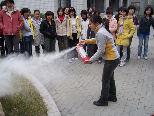 随着一声响亮的口哨声,梅苑1号楼的同学们紧张而又有序地从寝室撤出,经过安全通道到达了宿舍楼下的空地,成功地完成了30秒撤离宿舍的逃生演习。接下来,保卫处的路老师和谢老师示范了灭火器的使用方法。同学们也作了演练,基本掌握了灭火器的使用方法。