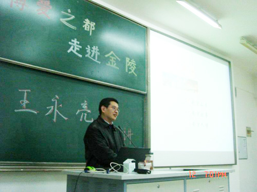 主持人通过图片和视频向大家展示了南京的概况,其中包括南京的地理位置、历史变迁、人物古迹等。随后,特邀嘉宾王永亮老师分别从“南京的山水”、“南京的故事”、“南京的人情”三个方面用朴实生动的语言,为大家刻画了一个既富有浓郁历史文化色彩,又不乏现代化气息的南京。本次活动的开展使同学们对南京这个古老而又现代化的城市有了更深层次的了解。