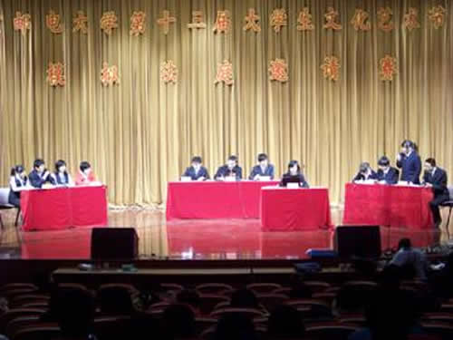 2008年12月23日晚,由南京邮电大学校团委主办、人文与社会科学学院分团委承办的“南京电信·学子e行”杯校第十三届大学生文化艺术节之模拟法庭邀请赛决赛在仙林校区大学生活动中心小礼堂隆重举行。人文与社会科学学院党委书记周健、党委副书记李承晟、南京市栖霞区人民法院研究室主任、国家三级法官沈小军,校团委沈媛媛老师,人文与社会科学学院分团委书记王广红,自自动化学院的分团委副书记李晓华等嘉宾出席了本次活动。