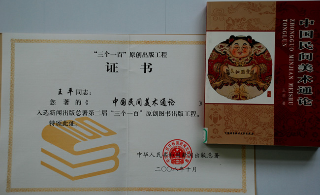 “三个一百”原创出版工程由新闻出版总署2006年发起,每两年评选一次,从近年出版的原创图书中推荐、评审人文社科、科学技术、文艺少儿三类优秀原创图书各100种。旨在推动国产图书的原创性。所收图书均为国内作者编著、国内出版社出版,确属精品力作的图书,评选分为人文社科类、自然科技类和文艺与少儿类3类,每类100种。经过几年的发展,“三个一百”原创出版工程奖已经和中宣部“五个一工程”奖、中国图书出版政府奖并称全国新闻出版行业“三大奖”,具有相当高的社会影响力。第二届“三个一百”原创出版工程于2008年3月启动,全国五百多家出版单位从30余万种图书中共推荐了1008种备选图书,由来自国家各部委研究机构、中国科学院、中国社会科学院及北京大学、中国人民大学等高校几十位各学科领域的知名专家学者以及院士,以严谨、认真、科学、宁缺毋滥的态度和原则,经过严格审读、论证和讨论后,按照资格审查、小组筛选、大会讨论、专家投票、社会公示的程序,以不记名投票的方式,最终遴选出第二届“三个一百”原创出版工程入围优秀图书293种,其中人文社科类94种、科学技术类100种,文艺少儿类99种,我校王平教授的《中国民间美术通论》名列文艺少儿类获奖图书。