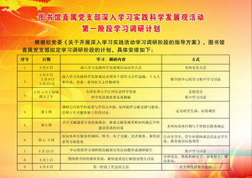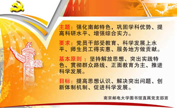 按照省委、省委教育工委的统一部署,我校开展深入学习实践科学发展观活动。图书馆直属党支部响应校党委的号召,统一思想、把握精神、精心组织,在认真学习的同时制定了详细的宣传计划。图书馆不仅两个分馆都放置了宣传展板,还在三牌楼校区图书馆采用电子屏滚动播放的形式,大力宣传开展学习实践科学发展观活动的重大意义。在宣传方式上,图书馆勇于创新,特别制作了轻巧精美的宣传卡片,将此次活动的主题、总体要求、基本原则和具体目标传达到图书馆每一个工作人员;同时利用开座谈会和走访调研的机会,向师生发放宣传卡片,力争为学习实践活动的健康发展创造和谐良好的氛围。