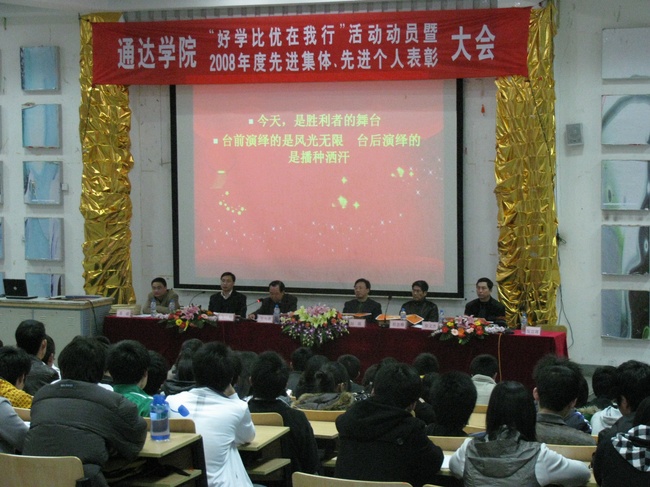 院党委书记王夫善对开展“好学比优在我行”主题教育活动的意义、目标、内容和要求进行了动员。他强调指出,开展这项活动是当前及今后一段时期我院学生思想教育的主课题,也是塑造通达学院良好形象的关键,对进一步改进并优化我院学风,培养学生主动学习、自我管理意识,提高学生的综合素质,提升我院基础文明建设水平,进而形成长效机制,具有重要而深远的意义。他要求把“好学比优在我行”活动与深入学习实践科学发展观紧密结合,以实际行动推进通达学院各项工作的发展。杜忠顺院长对“好学比优在我行”主题教育活动各阶段的目标和安排进行部署。同时,宣读了对2007∕2008学年先进班级集体和先进个人的表彰决定并颁奖。