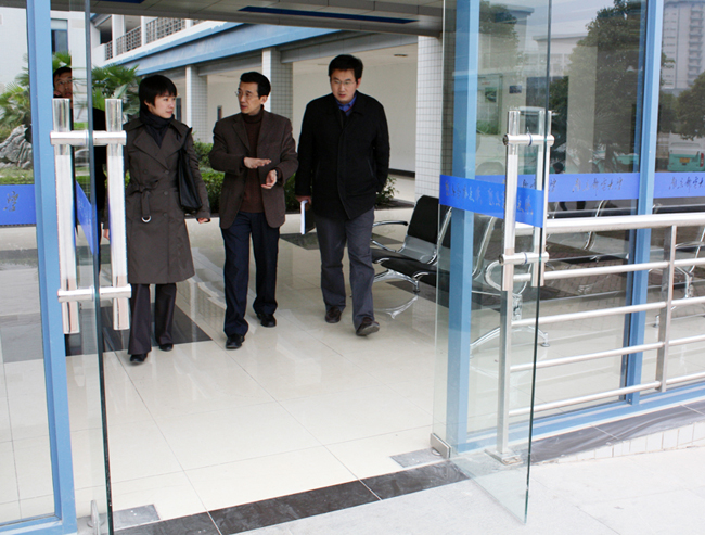 杨校长一行首先来到了教学楼门厅封闭工程现场,张沂副处长详细汇报了工程进度、建材质量、安全生产以及建成后使用效果等情况。