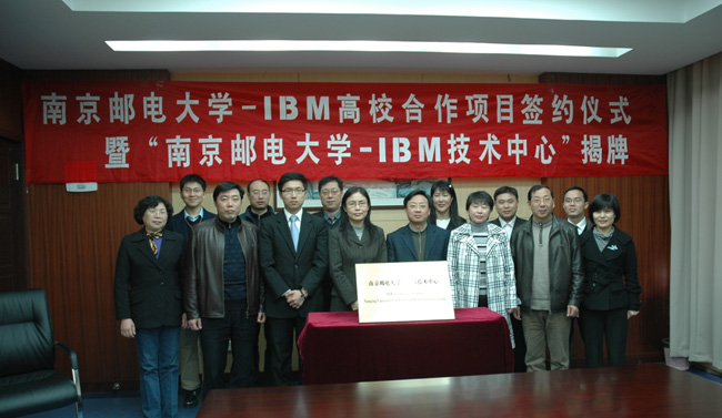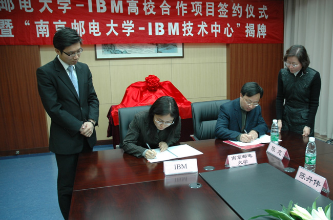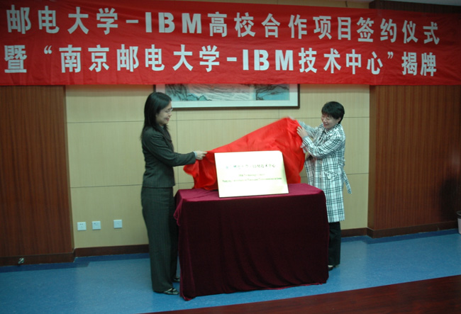 2009年3月30日下午,南京邮电大学-IBM高校合作项目签约和“南京邮电大学-IBM技术中心”揭牌仪式在我校仙林校区举行。副校长刘陈教授、副校长叶美兰教授、计算机学院院长杨庚教授、党委副书记李其芳、副院长陈丹伟、IBM中国区大学合作部总经理李晶晖女士、IBM大学合作部项目经理周恩昌出席了此次签约与揭牌仪式。计算机学院相关老师参加了此次活动。
