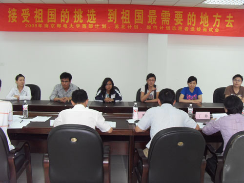 根据团省委、省苏北计划项目办《关于开展“西部计划”、“苏北计划”、“绵竹计划”高校审核工作的通知》要求,5月12日下午2:30,我校项目办在仙林大学生活动中心会议室,举行了2009年西部计划、苏北计划、绵竹计划志愿者选拔面试会。学生处副处长丁静老师、教务处副处长赵洪牛老师、学生处心理咨询中心张秀敏老师、校团委书记张翼老师、校项目办联系人凌海峰一同出席了本次面试会。