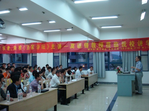 2009年5月21日晚19:00,仙林校区教2-211教室座无虚席。南京大学中文系教授、著名古代文学研究专家、中央电视台《百家讲坛》著名主讲人莫砺锋教授应邀做客理学院“博士讲堂”,为同学们做了一场关于唐宋诗词的精彩专题讲座,理学院院长李雷教授主持讲座并致辞。