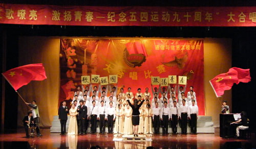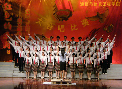伴随着慷慨激昂的旋律,各支代表队依次登场,激情演绎了《共青团员之歌》、《我和我的祖国》、《精忠报国》、《我们众志成城》、《手牵手》、《爱 因为在心中》等曲目。各代表队服装整齐,感情饱满,歌声嘹亮,整个比赛过程高潮迭起,富有创意的诗歌朗诵、舞台表演也为整场比赛增添了许多亮点。激情昂扬的歌声歌唱着美好的生活,更传达着大家对祖国母亲的美好祝愿。经过激烈的角逐,最终2008级通信工程专业代表队以一首《歌唱祖国》力压群雄,获得本次比赛冠军。