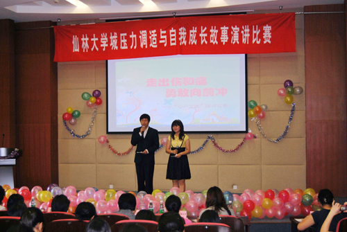 6月3日下午,由仙林大学城心理健康与教育研究中心主办、我校学生处心理健康教育中心承办的仙林大学城“压力调试与自我成长故事演讲比赛”在我校行政楼报告厅举行。本次演讲比赛以“走出伤和痛,勇敢向前冲”为主题,旨在通过大学生讲述自我与压力共处的心情故事,启发其对压力的思考,学会与压力同行。仙林大学城心理健康与教育研究中心主任、南京师范大学大学生处副处长兼心理健康教育中心主任周红老师,我校学生处副处长丁静老师作为特邀嘉宾出席本次活动,来自仙林各高校的9位老师担任比赛评委,各高校推荐的18位选手参加了比赛。