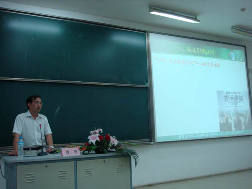 曾智副教授从心理学角度给同学们分析了当代大学生应该如何正确认知自我并成功实现自我超越。讲座由五个毛毛虫的故事、香港是谁、张艺谋的故事开始,通过对同学们生活中经常遇见的场景进行分析,告诉同学们应如何进行准确的自我定位和建立有助于自己成功的“心锚”,着重强调了应该时刻“认清自己的角色,活在当下”,尊重和把握身边的每一个人和每次机会。接着,曾智副教授又分别从成功的大学需要情感的支持和抚慰、为自己的错误买单、做一个对自己社会负有责任心的人等十个方面阐述了如何“从认同到超越”。