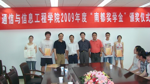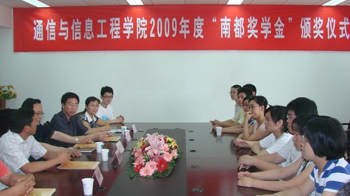 6月19日,通信与信息工程学院举行2009届毕业生“南都奖学金”颁奖仪式暨毕业生座谈会。浙江南都电源动力股份有限公司陈象豹经理,学院党委书记房胜汛、副院长李晓飞等出席颁奖仪式。仪式由学院党委副书记彭洋主持,20名获奖毕业生参加了仪式。陈经理和院领导给获奖优秀毕业生颁发了奖励证书和奖励金。仪式结束后,召开了座谈会。