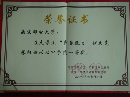 7月7日下午,鼓楼区召开“青春感言”征文活动表彰大会,我校荣获征文组织一等奖,我校陆键同学和龚萌萌同学的参赛作品分获一等奖和二等奖。 此次征文活动由鼓楼区人口和计划生育局及计生协会主办,旨在推动“青春健康教育”活动的深入开展,展现新一代青年学子的风采,我校团委和计生委积极组织发动学生参与。该活动历时两个月,通过网上征集、网上投票、专家评审等环节,共评出16篇获奖作品,共有12所学校被授予组织奖。