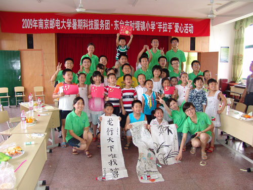 为了丰富农村留守儿童的假期生活,7月17日下午,服务团来到东台市时堰镇小学开展了“大手拉小手”助学活动。丰富多彩的文艺表演、益智有趣的智力游戏、充满想象力的手工制作,一刹那间整个教室就变成了欢乐的海洋。由大家共同制作完成的立体国旗更是表达了大家对祖国母亲60岁生日深深的祝福。
