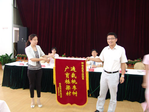 7月19日,以“践行科学发展,服务和谐东台”为主题的“南京邮电大学大学生暑期科技服务团”社会实践活动闭幕式隆重举行,东台市委常委、常务副市长周俊,东台市市政府办公室副主任许学军,团市委书记朱雯,我校团委书记张翼以及科技服务团全体成员参加了闭幕式。闭幕式上,我校团委书记张翼老师对本次暑期实践活动做了总结并代表服务团全体成员向东台市各级领导以及相关企业对本次实践活动的关心支持表示衷心的感谢。东台市市政府办公室副主任许学军对我校此次暑期实践活动给予了充分肯定,并对活动的圆满成功表示祝贺。最后,我校团委张翼书记代表服务团将其亲笔书写的“东方湿地,魅力尽显;绿色东台,更上层楼”美好祝福赠送给周俊副市长;周俊副市长亦代表东台市委市政府赠送中国名绣--东台发绣给我校,并祝愿我校发展更上一层楼。
