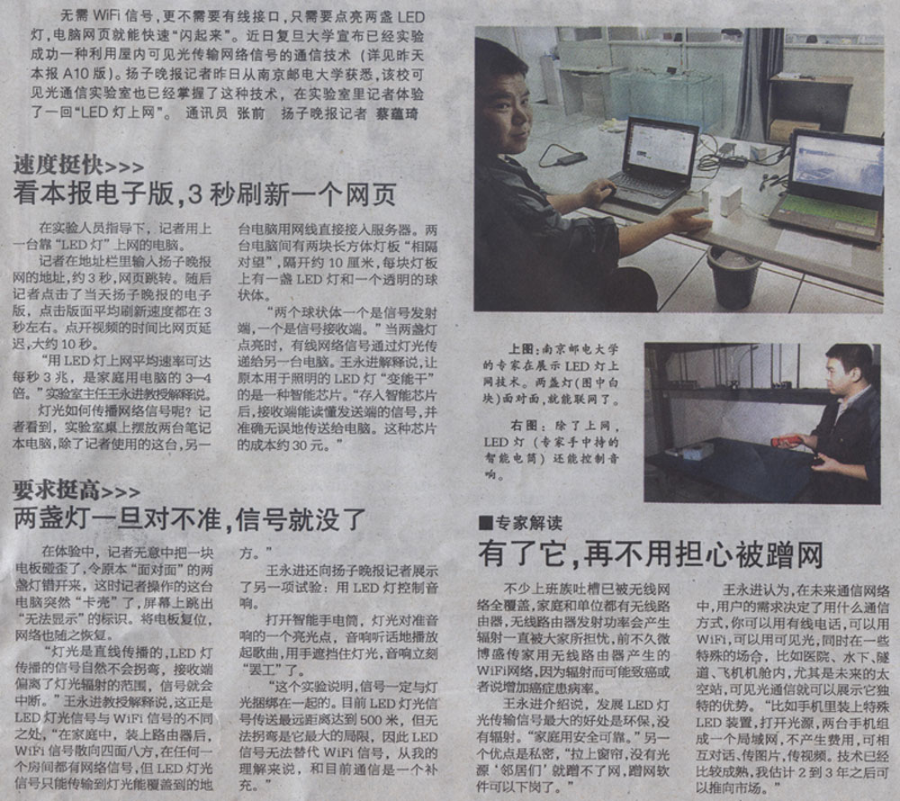 【扬子晚报】扬子记者在南邮体验“LED灯上网”