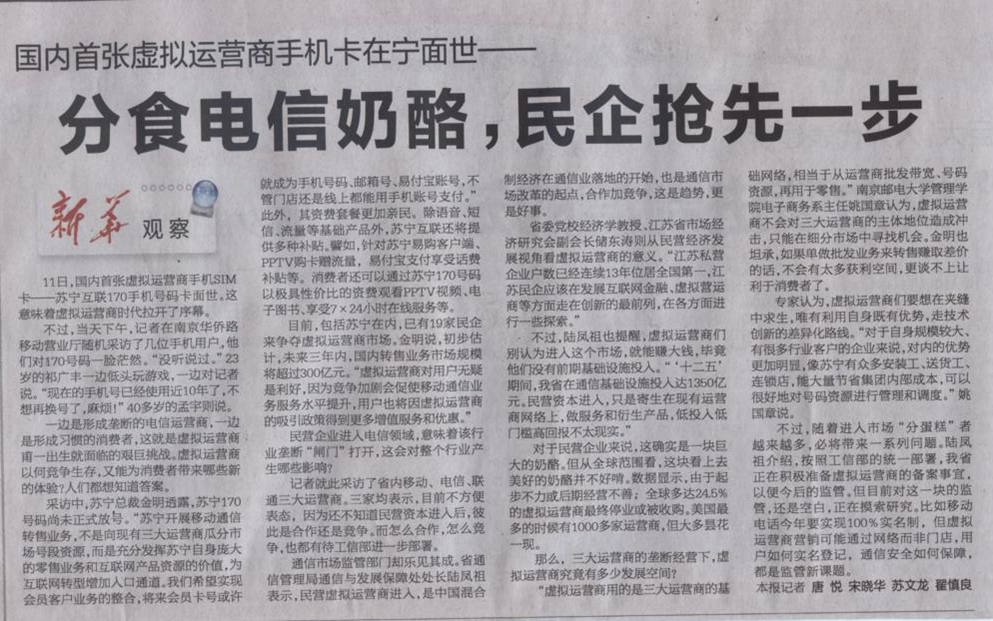 【新华日报】分食电信奶酪,民企抢先一步