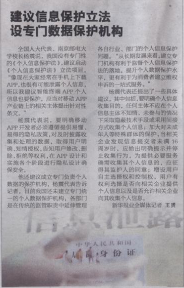 【扬子晚报】建议信息保护立法 设专门数据保护机构