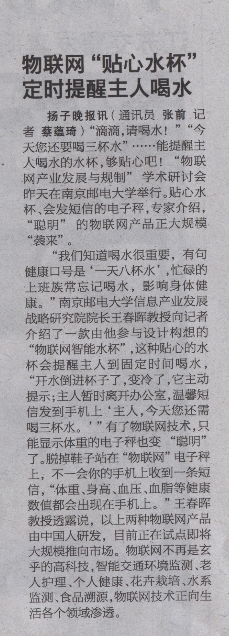 【扬子晚报】物联网“贴心水杯”定时提醒主人喝水
