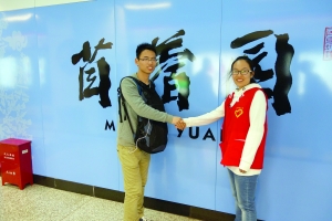 于是,5个年轻人在拍照的同时,增添了一项“特别”的内容——与陌生人握手并合影。在每一站台内,他们主动上前找一个陌生人,告诉这个陌生人他们正在做的活动,并且邀请他一起合影。合影之后,几个年轻人也特意送上自制的一个爱心徽章,以感谢这个愿意配合的陌生人。