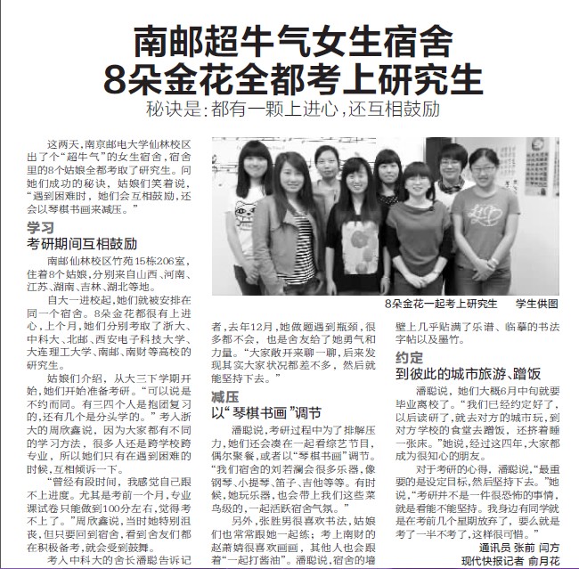 【现代快报】南邮超牛气女生宿舍 8朵金花全都考上研究生
