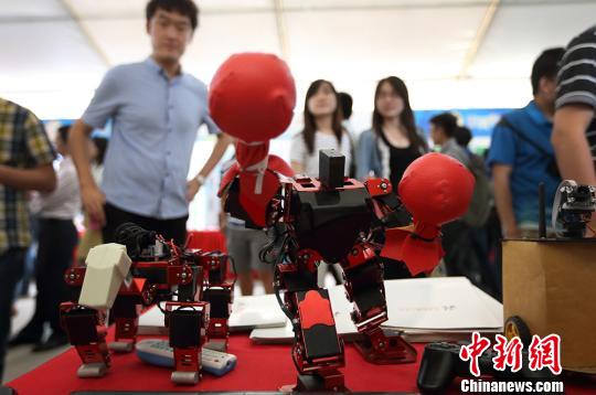 大学生在展示能模仿拳击手的“智能机器人”。泱波 摄