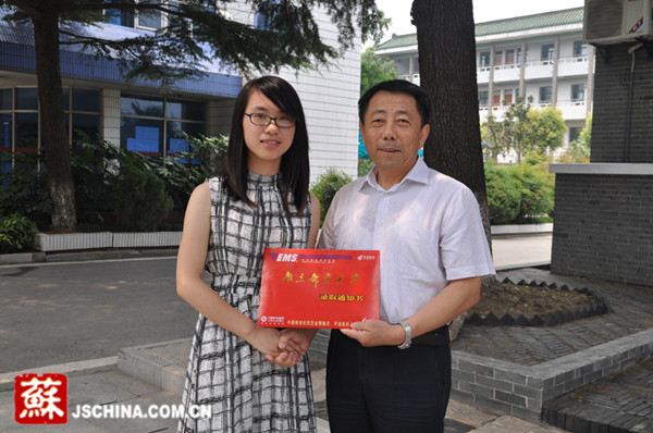 南邮大党委副书记朱永平教授为沭阳县中学司慧灵颁发录取通知书