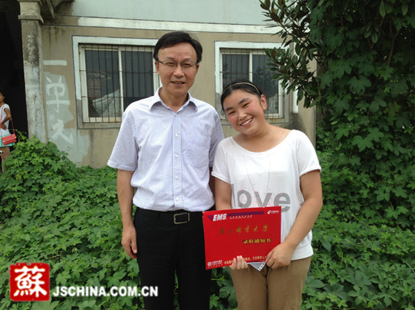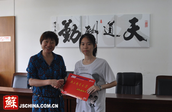 南京邮电大学副校长叶美兰教授为沙洲中学朱倍倍颁发录取通知书