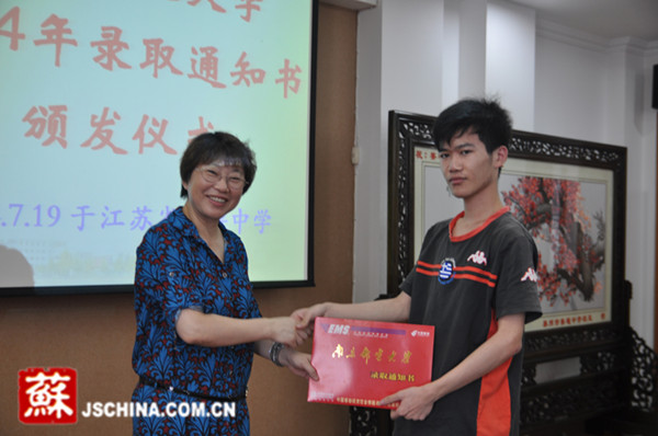 南邮大副校长叶美兰教授为姜堰中学许永辉颁发录取通知书
