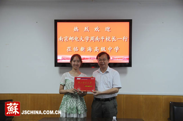 南京邮电大学党委常委、副校长周南平为新海高级中学陈萌萌颁发录取通知书
